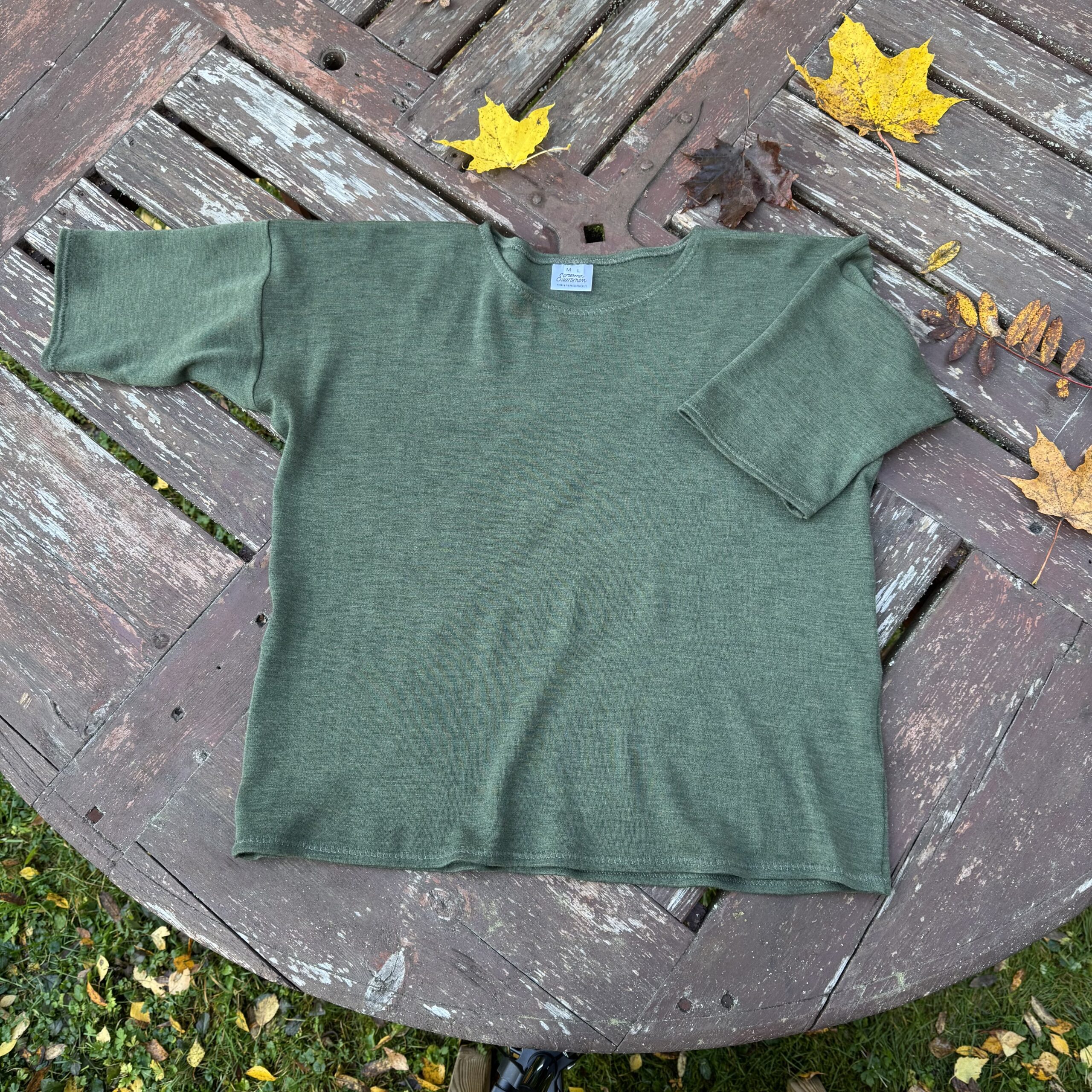 Merinovillaneuloksella on kaikki villan hyvät ominaisuudet: joustavuus, hengittävyys, hylkii likaa ja lämmittää. Merinovilla on myöskin todella pehmeää iholle, eikä kutita herkkääkään ihoa. Malli on suora ja neulos on todella joustavaa.