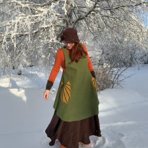 Kuvissa Niinalla on M-koko ja alle on puettu resorivyötäröinen kellohame ja puuvillainen paita. Keltainen talvikeiju on L koko ja alla on pitkä pellavahame.